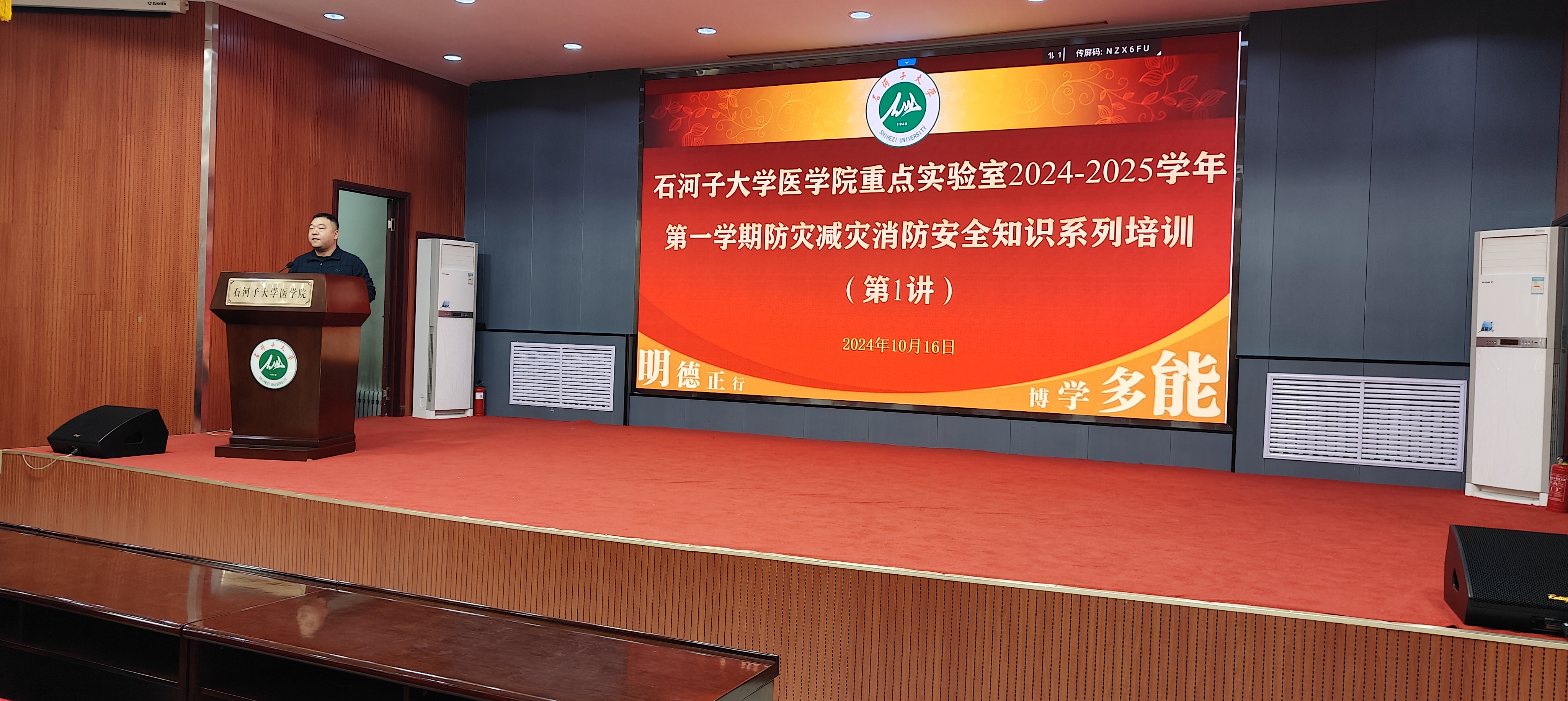 金沙娱乐城 重点实验室2024-2025学年第一学期 防灾减灾消防安全知识系列培训第一讲开讲 为进一步增强学院全体科研人员消防安全防范意识,宣传消防安全知识,切实提升科研人员的自我保护能力,营造良好的消防安全校园环境,石河子大学澳门金沙娱乐城官网 重点实验室联合保卫部消防科,对各科研团队师生代表开展2024-2025学年第一学期防灾减灾消防安全知识系列培训讲座。10月16日上午十二点,第一讲消防安全培训顺利开讲,150余名师生代表参加了培训。