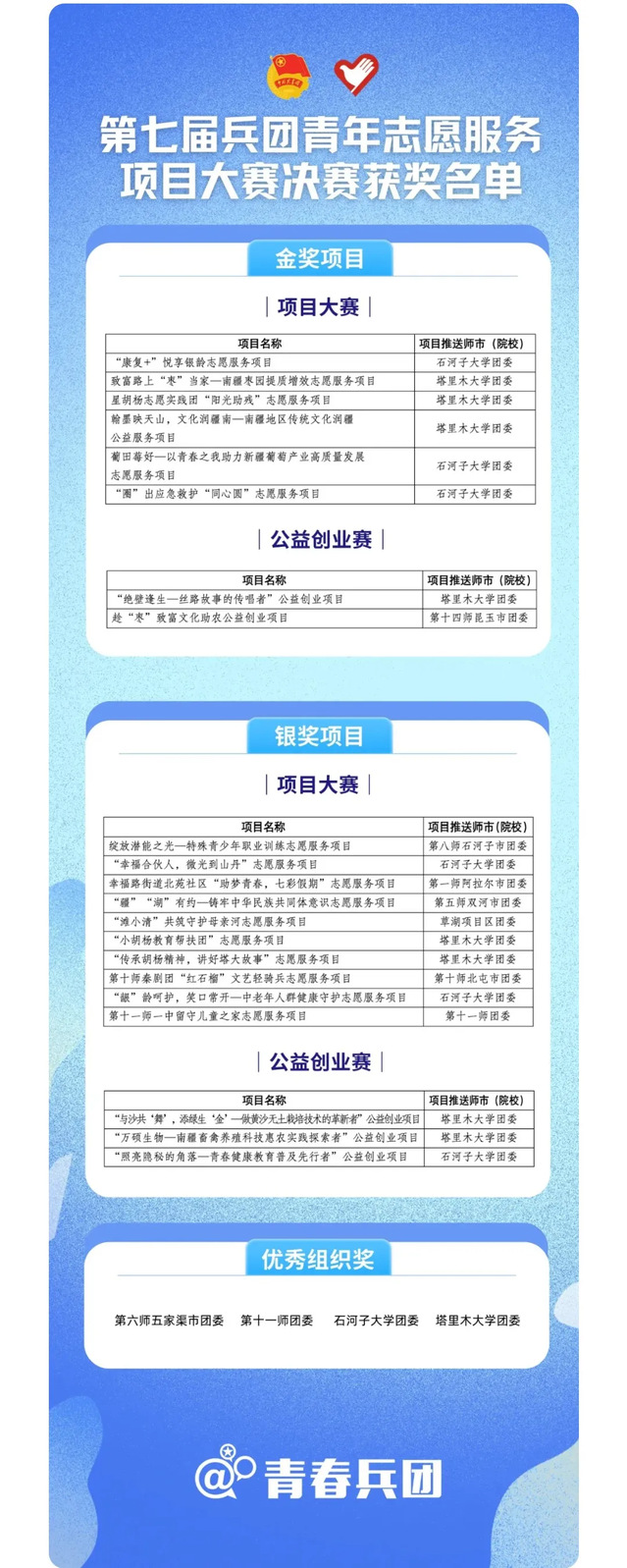 9月4日-5日,第七届兵团青年志愿服务项目大赛决赛暨志愿服务交流会在五家渠市圆满闭幕。我院选送的三个志愿服务项目经过激烈角逐,最终喜获两金一银的优异成绩,展现了我院青年志愿者的卓越风采和专业能力。