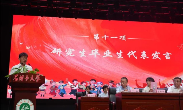 大会第十一项 研究生毕业生代表孙立明发言。他用石大是“港湾”是“舞台”回顾了在金沙娱乐城 求学的数载。分享了他通过重重考核成功入职开启自己“打工人”之旅的背后,是感恩母校为莘莘学子提供了系统的医学教育、扎实的科研训练,以及探索专业领域以外的平台和机会。