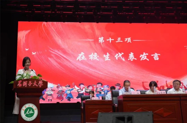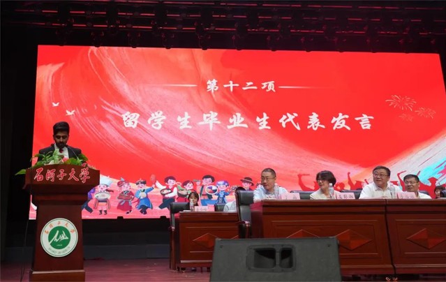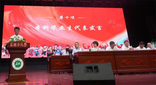 大会第十项 本科毕业生代表杜威发言。他用“感动、感谢、感恩”作为主题词,讲述了他与石大澳门金沙娱乐城官网 邂逅的故事,他号召各位毕业生朋友们在未来不断学习积极进取,为祖国的医学事业贡献力量,同时祝福老师们身体健康、工作顺利,祝愿母校人才辈出、永续华章。