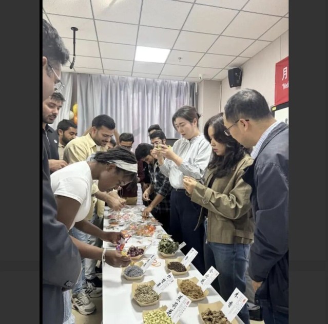 本次活动的亮点是独具澳门金沙娱乐城官网 特色的“巧手制香囊”环节。在老师的指导下,留学生们亲手挑选艾草、薄荷等中草药,一针一线地缝制起充满吉祥寓意的中秋香囊。这一活动不仅让他们体验了中国传统手工艺的乐趣,更将中医药文化知识融入其中,直观地感受到了中医“未病先防”的养生智慧。来自印度的SRUJAN同学拿着自己制作的香囊说:“这太神奇了!这些草药的味道让人心旷神怡,我终于亲手触摸到了在课本上学到的中药,这让我对中医文化更加着迷了。”