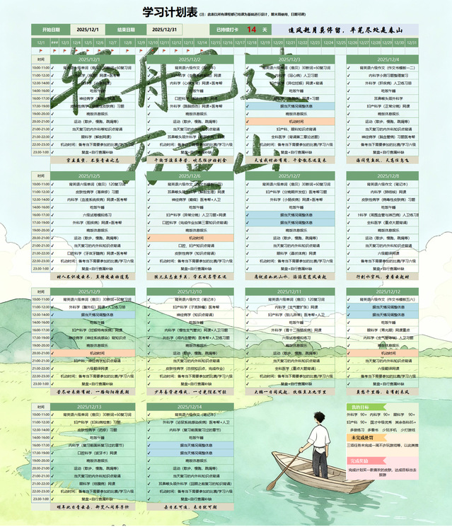 学习计划表挑战赛不仅是医学生规划能力的试炼场,更是学子们交流学习方法的舞台,选手们以清晰的规划逻辑与前瞻的学习视野,彰显了医学生的专业素养与成长担当。