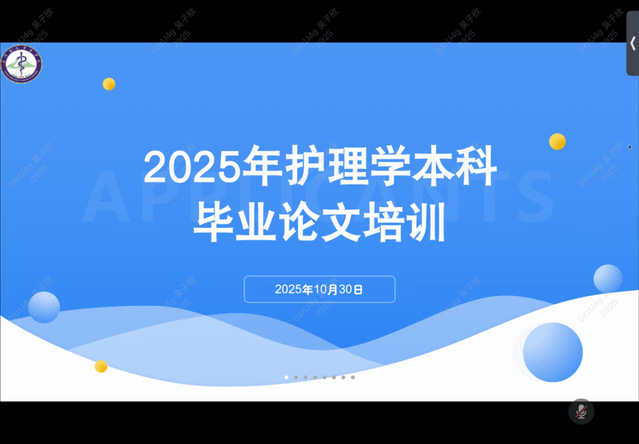 为规范2026届护理学本科毕业论文工作,明确开题报告撰写要求,2025年10月30日,护理学系通过腾讯会议举办“2026届护理学本科毕业论文安排及开题报告撰写培训”,全体论文指导老师及2026届护理学专业学生参与本次培训,此次培训由姬春老师主持。