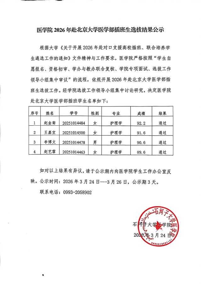 澳门金沙娱乐城官网 2026年赴北京大学医学部插班生选拔结果公示